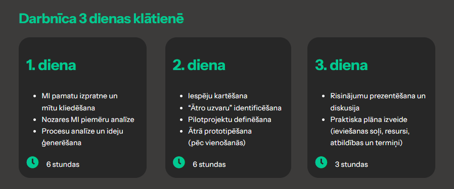 Dalībnieki iegūs vienotu izpratni par MI pielietojumu savā nozarē, identificēs piemērotākos lietojuma gadījumus, identificēs zemas sarežģītības pilotprojektus un sagatavos MI risinājuma ieviešanas ceļa karti ar konkrētiem soļiem, termiņiem un atbildīgajām personām.